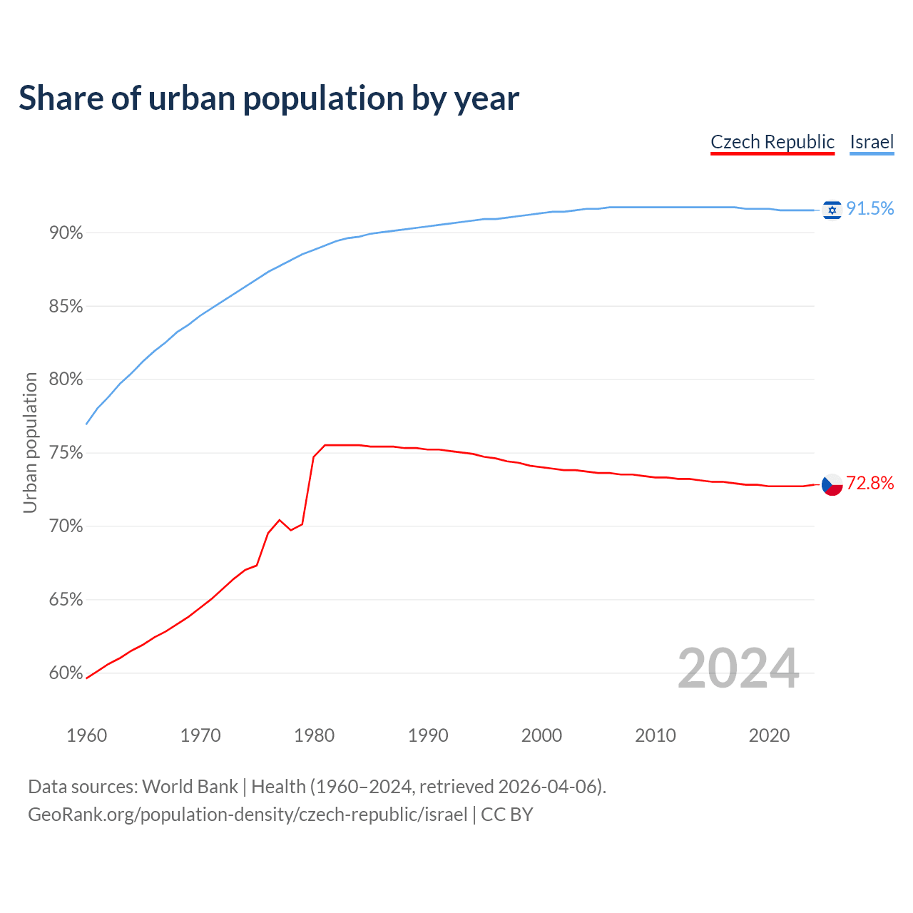 From 2004 to 2024, the share of urban population changed from 73.7% to 72.8% in the Czech Republic and from 91.6% to 91.5% in Israel.