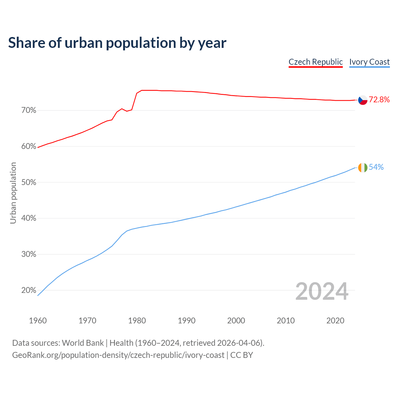 From 2004 to 2024, the share of urban population changed from 73.7% to 72.8% in the Czech Republic and from 44.7% to 54% in Ivory Coast.
