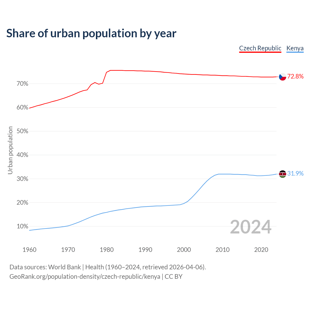From 2004 to 2024, the share of urban population changed from 73.7% to 72.8% in the Czech Republic and from 25.4% to 31.9% in Kenya.