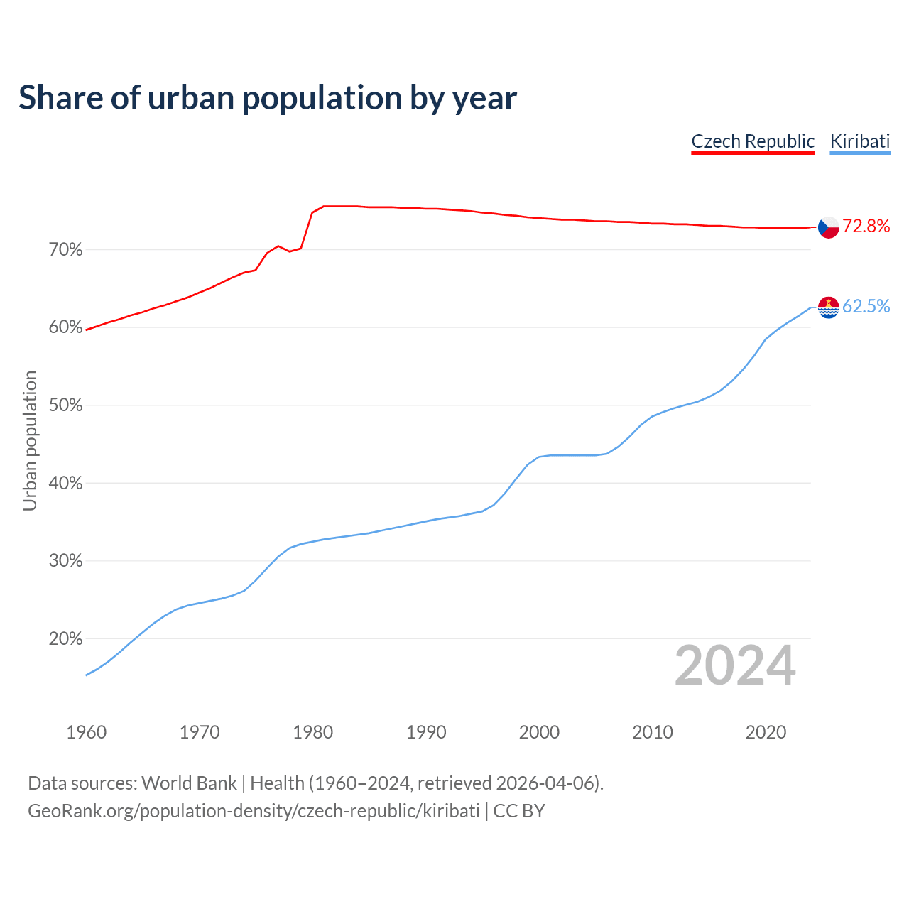 From 2004 to 2024, the share of urban population changed from 73.7% to 72.8% in the Czech Republic and from 43.5% to 62.5% in Kiribati.