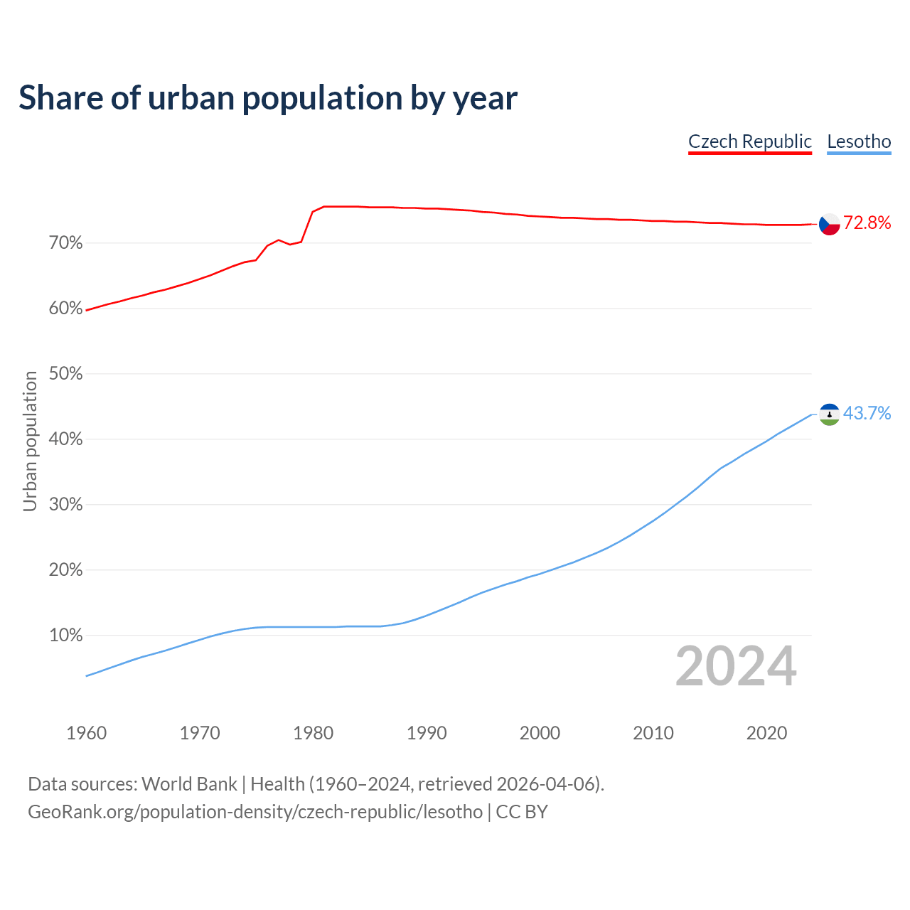 From 2004 to 2024, the share of urban population changed from 73.7% to 72.8% in the Czech Republic and from 21.8% to 43.7% in Lesotho.