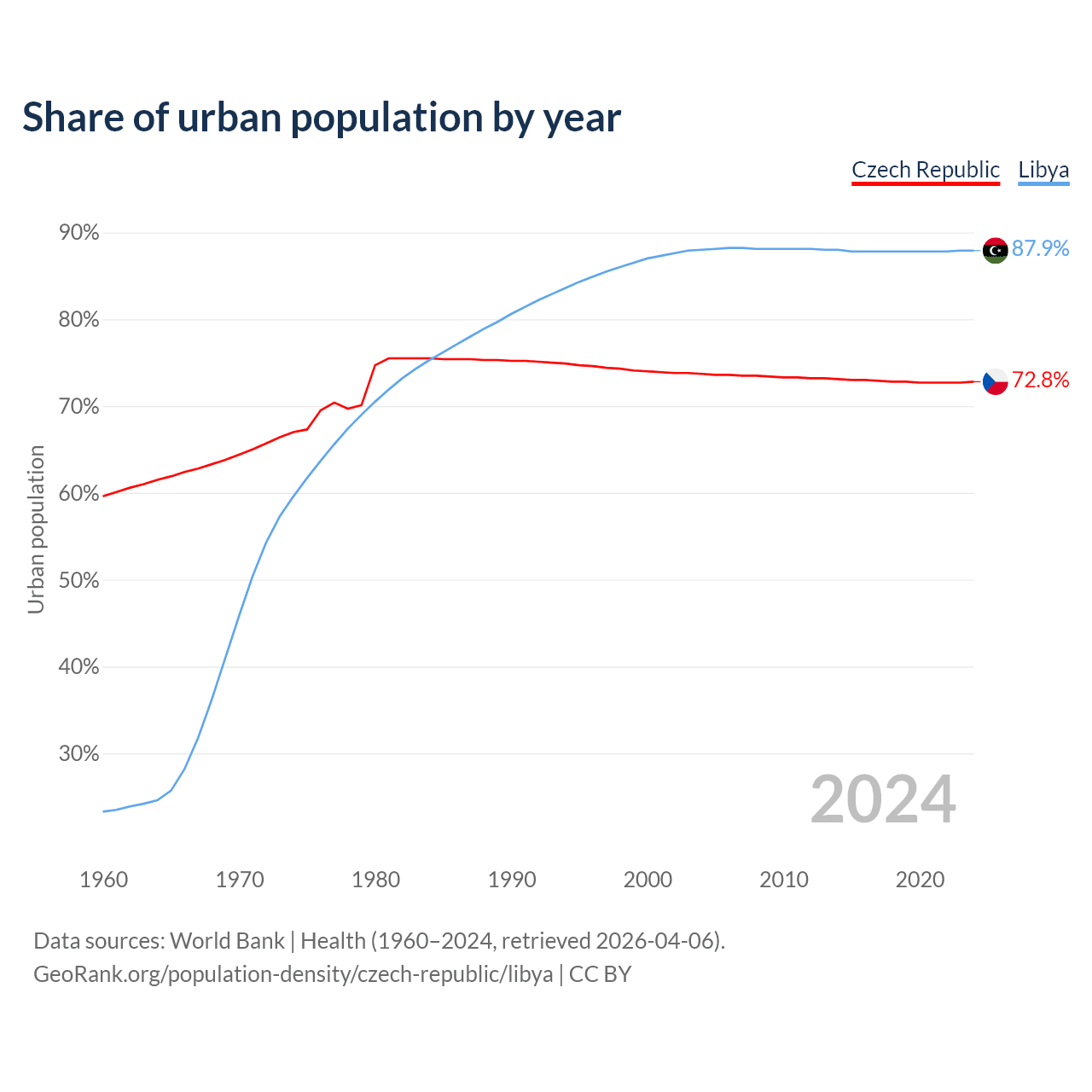 From 2004 to 2024, the share of urban population changed from 73.7% to 72.8% in the Czech Republic and from 88% to 87.9% in Libya.
