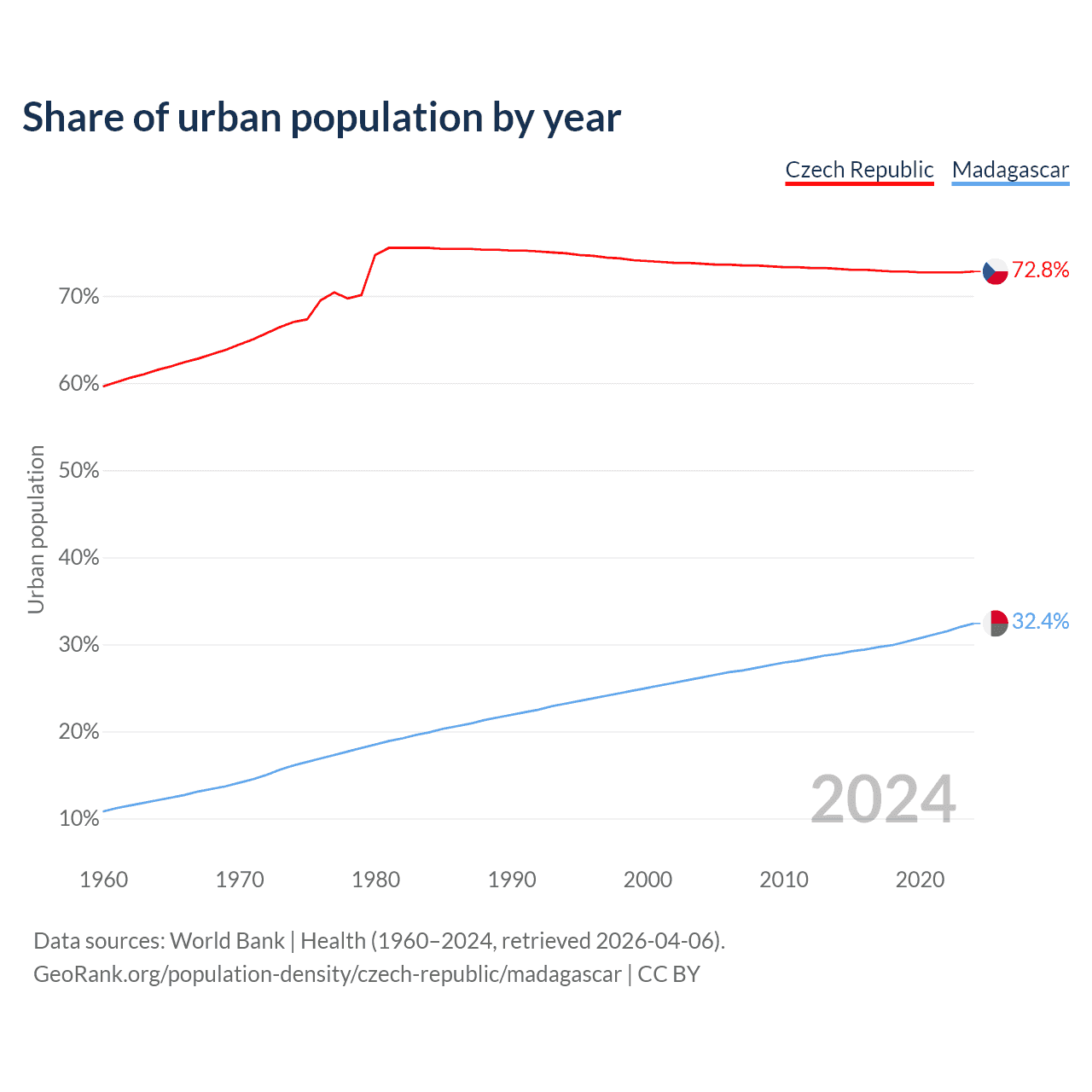 From 2004 to 2024, the share of urban population changed from 73.7% to 72.8% in the Czech Republic and from 26.2% to 32.4% in Madagascar.