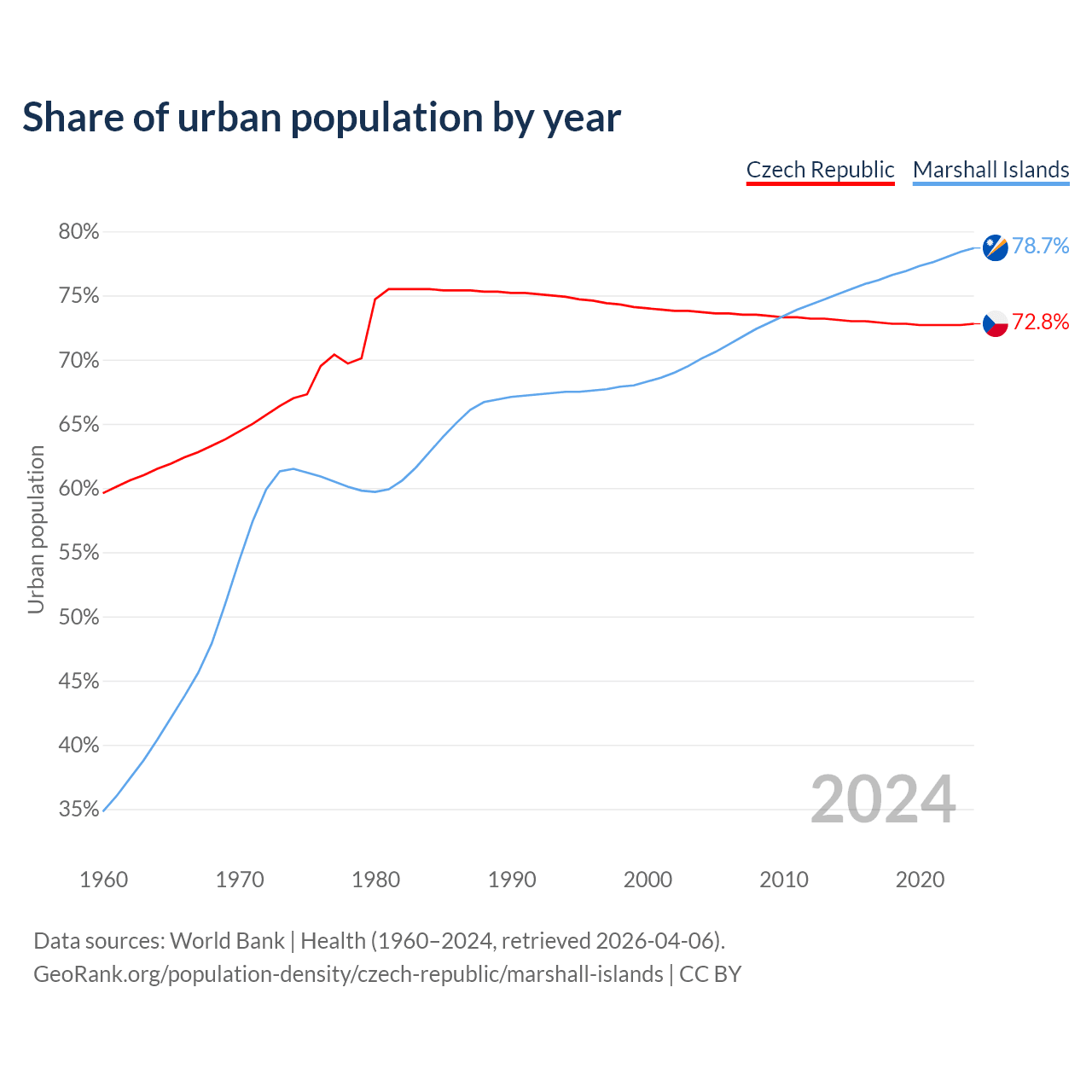 From 2004 to 2024, the share of urban population changed from 73.7% to 72.8% in the Czech Republic and from 70.1% to 78.7% in the Marshall Islands.