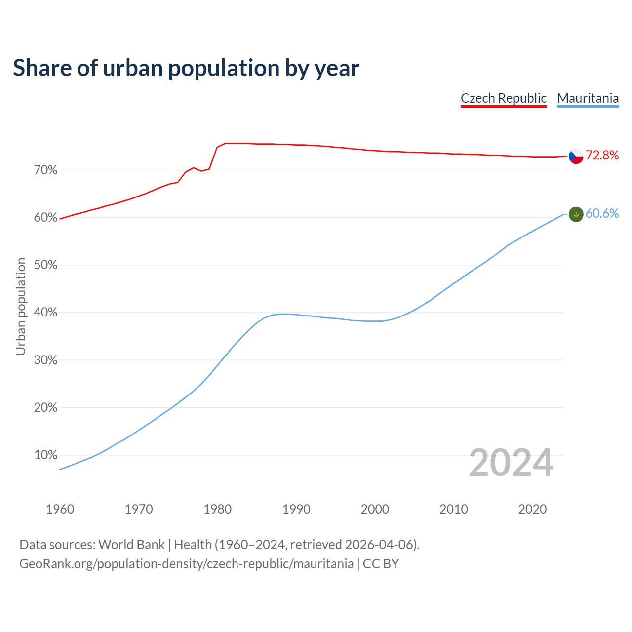 From 2004 to 2024, the share of urban population changed from 73.7% to 72.8% in the Czech Republic and from 39.6% to 60.6% in Mauritania.