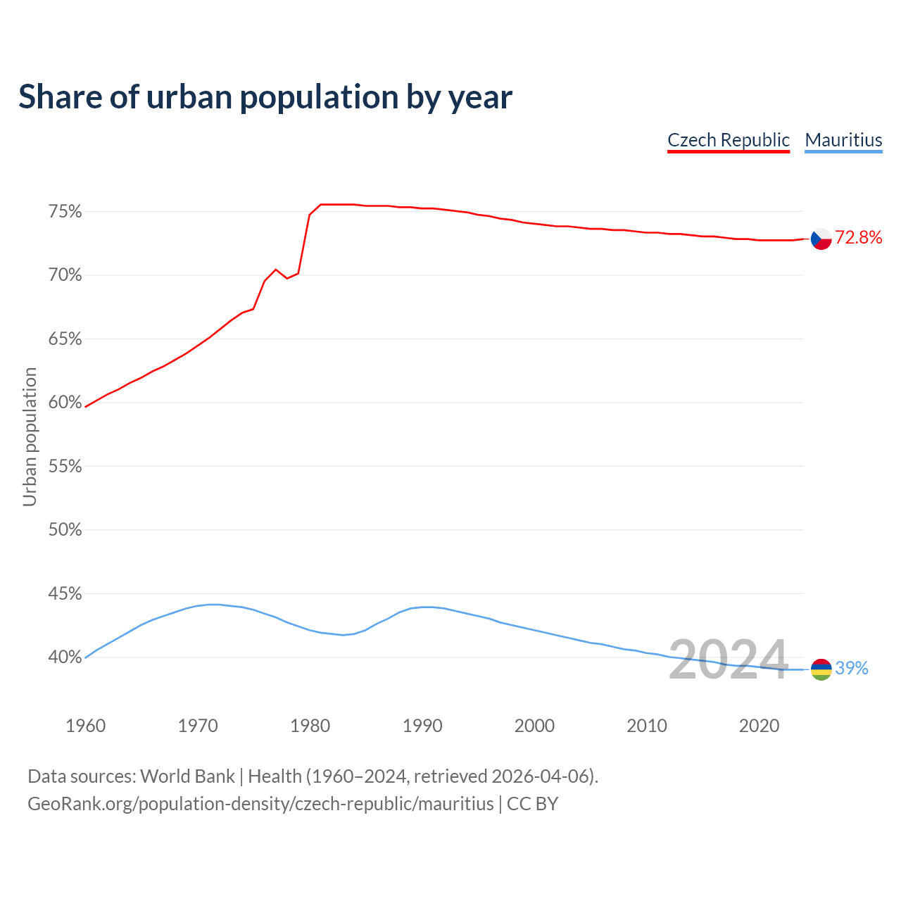 From 2004 to 2024, the share of urban population changed from 73.7% to 72.8% in the Czech Republic and from 41.3% to 39% in Mauritius.