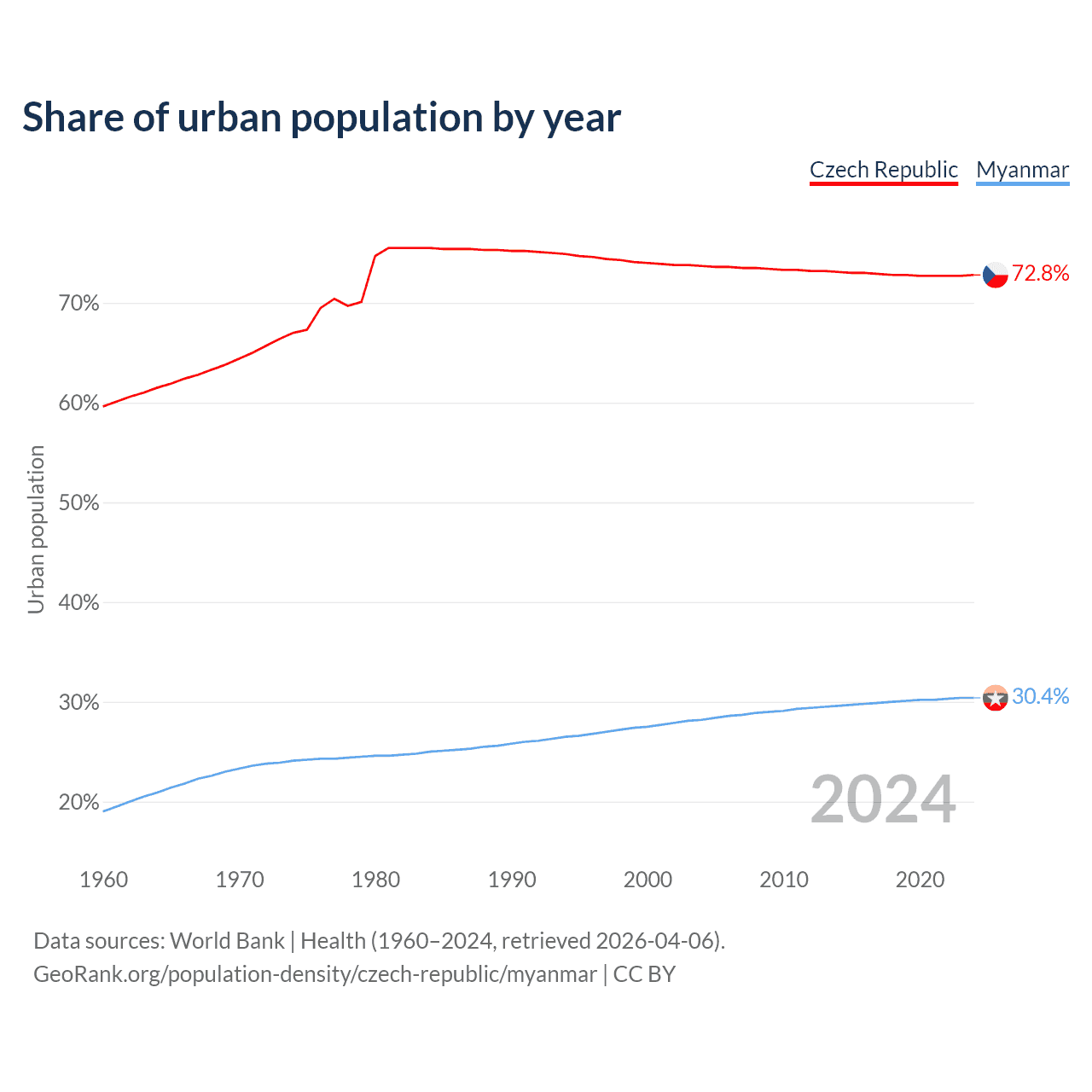 From 2004 to 2024, the share of urban population changed from 73.7% to 72.8% in the Czech Republic and from 28.2% to 30.4% in Myanmar.