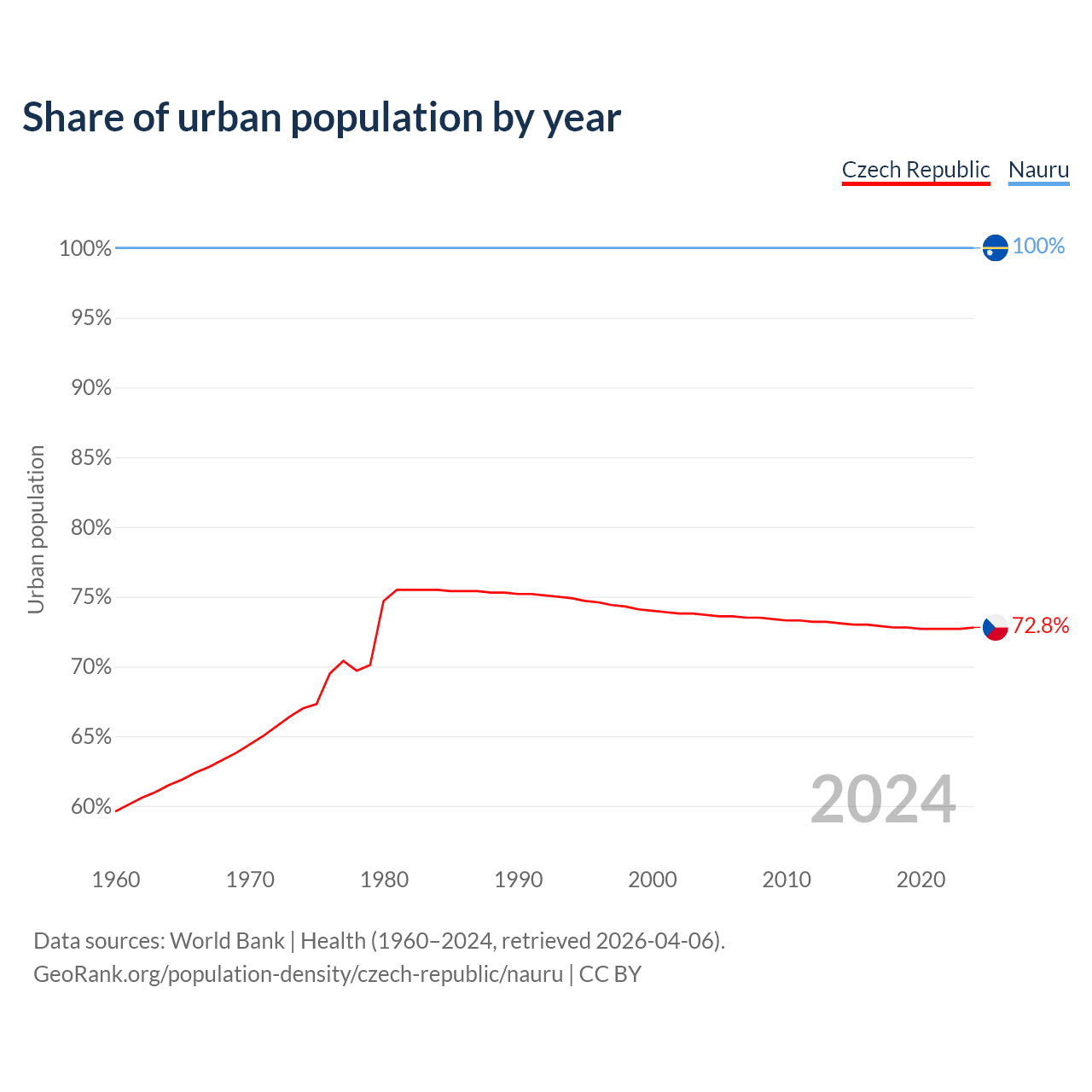 From 2004 to 2024, the share of urban population changed from 73.7% to 72.8% in the Czech Republic and from 100% to 100% in Nauru.