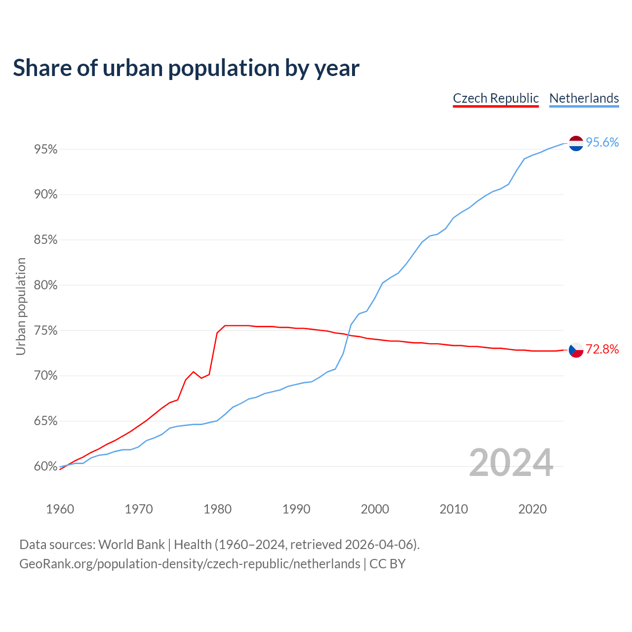 From 2004 to 2024, the share of urban population changed from 73.7% to 72.8% in the Czech Republic and from 82.3% to 95.6% in the Netherlands.