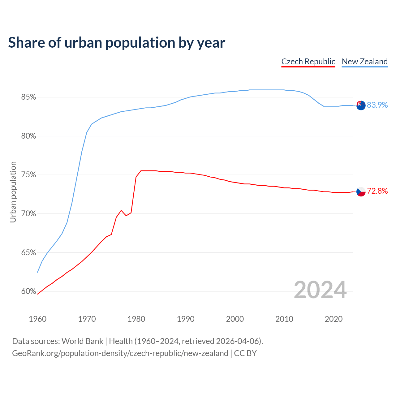 From 2004 to 2024, the share of urban population changed from 73.7% to 72.8% in the Czech Republic and from 85.9% to 83.9% in New Zealand.