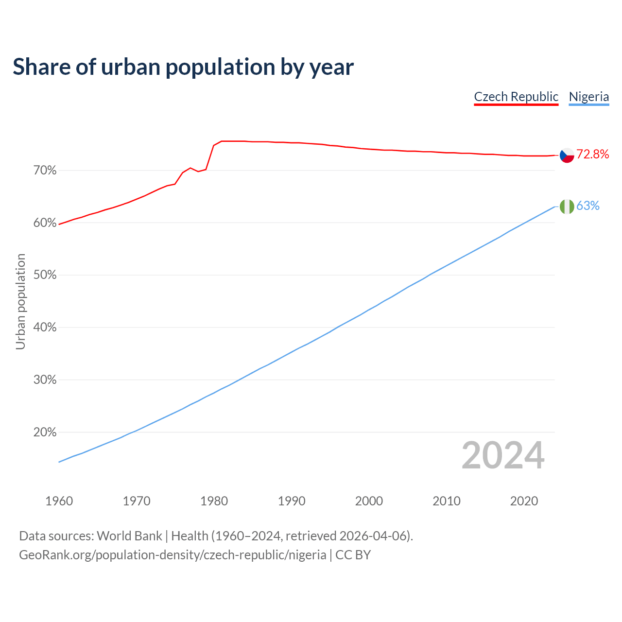 From 2004 to 2024, the share of urban population changed from 73.7% to 72.8% in the Czech Republic and from 46.7% to 63% in Nigeria.