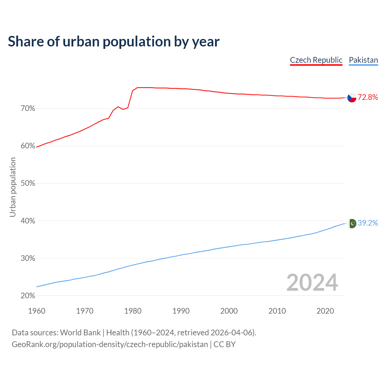 From 2004 to 2024, the share of urban population changed from 73.7% to 72.8% in the Czech Republic and from 33.7% to 39.2% in Pakistan.