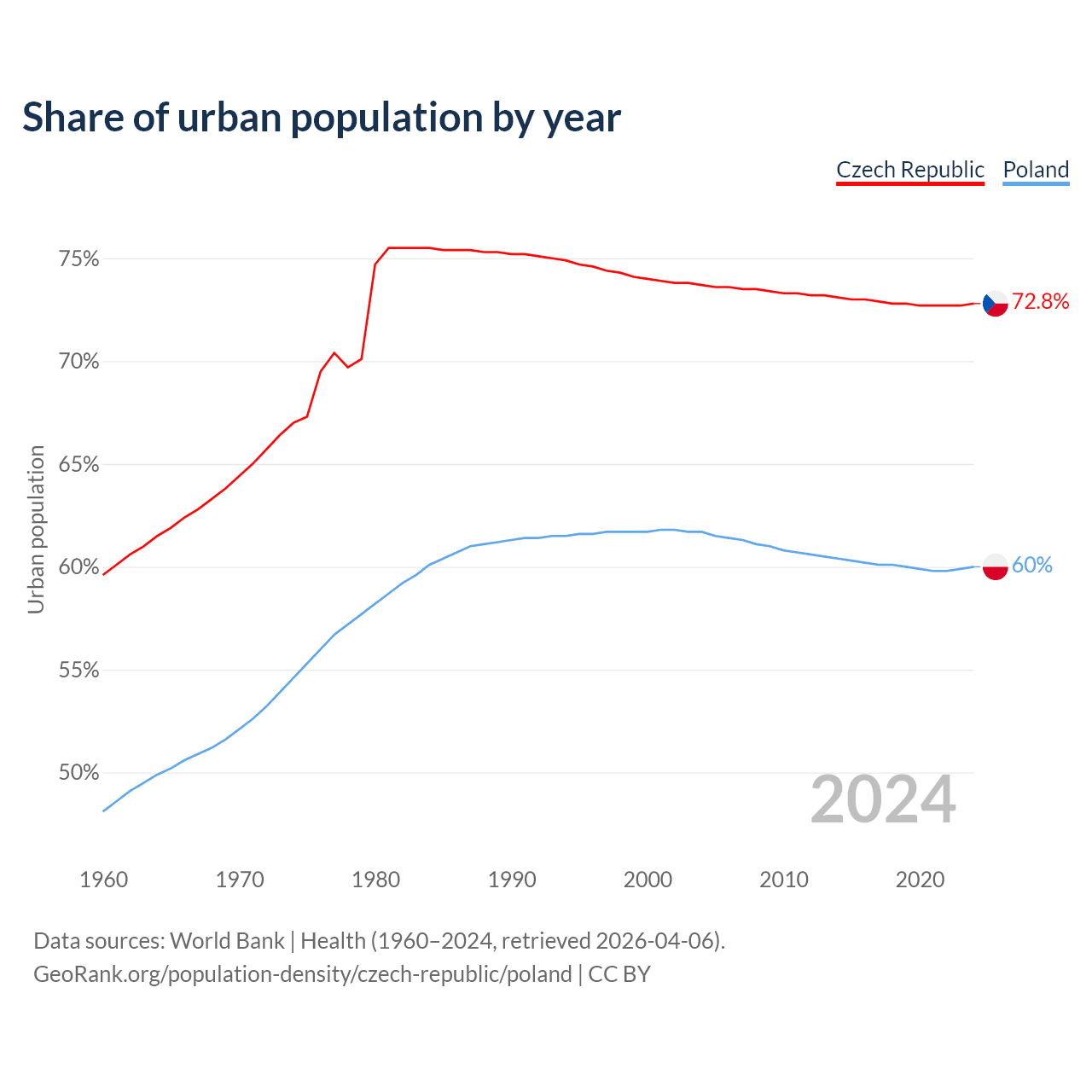 From 2004 to 2024, the share of urban population changed from 73.7% to 72.8% in the Czech Republic and from 61.7% to 60% in Poland.