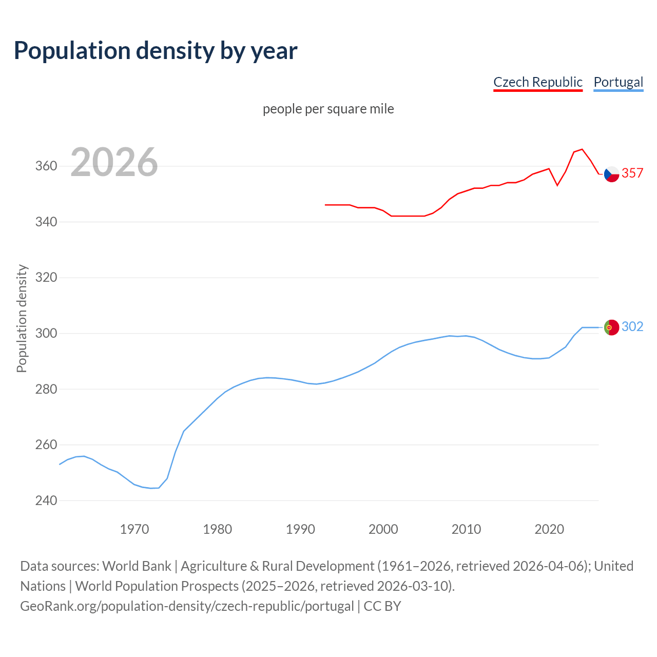 From 2006 to 2026, population density in the Czech Republic increased by 4.12%, compared to a 1.23% growth in Portugal.