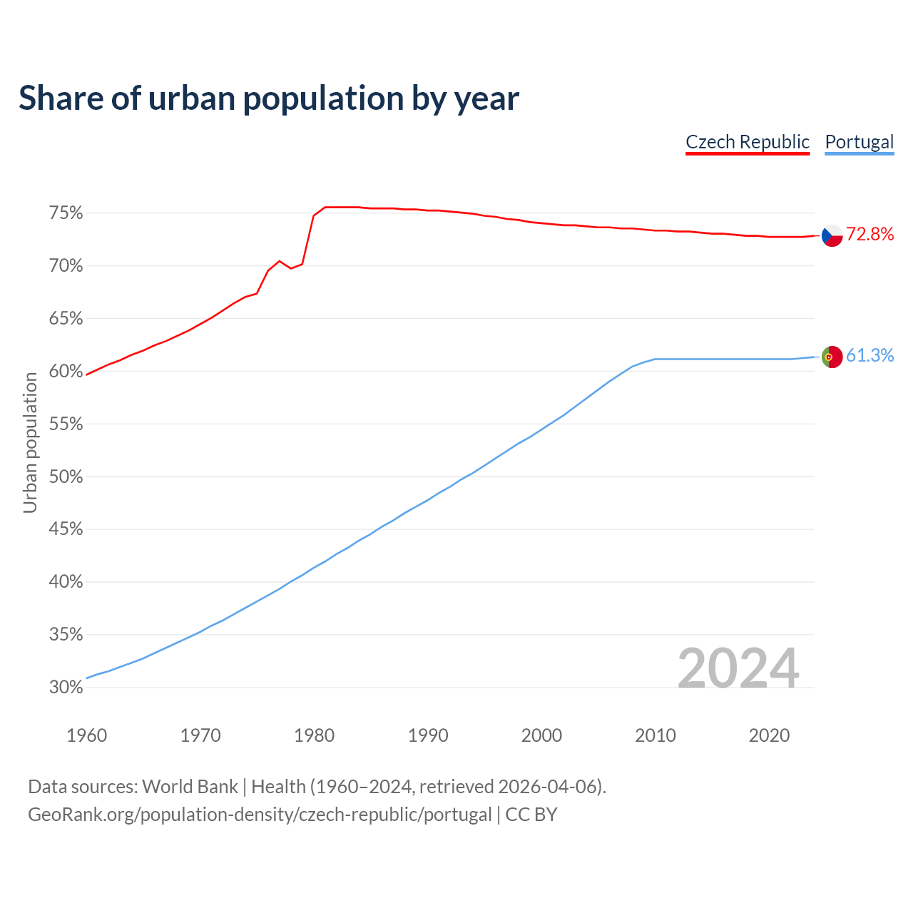 From 2004 to 2024, the share of urban population changed from 73.7% to 72.8% in the Czech Republic and from 57.4% to 61.3% in Portugal.