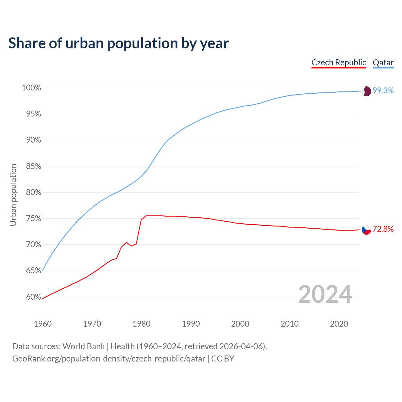 From 2004 to 2024, the share of urban population changed from 73.7% to 72.8% in the Czech Republic and from 97% to 99.3% in Qatar.