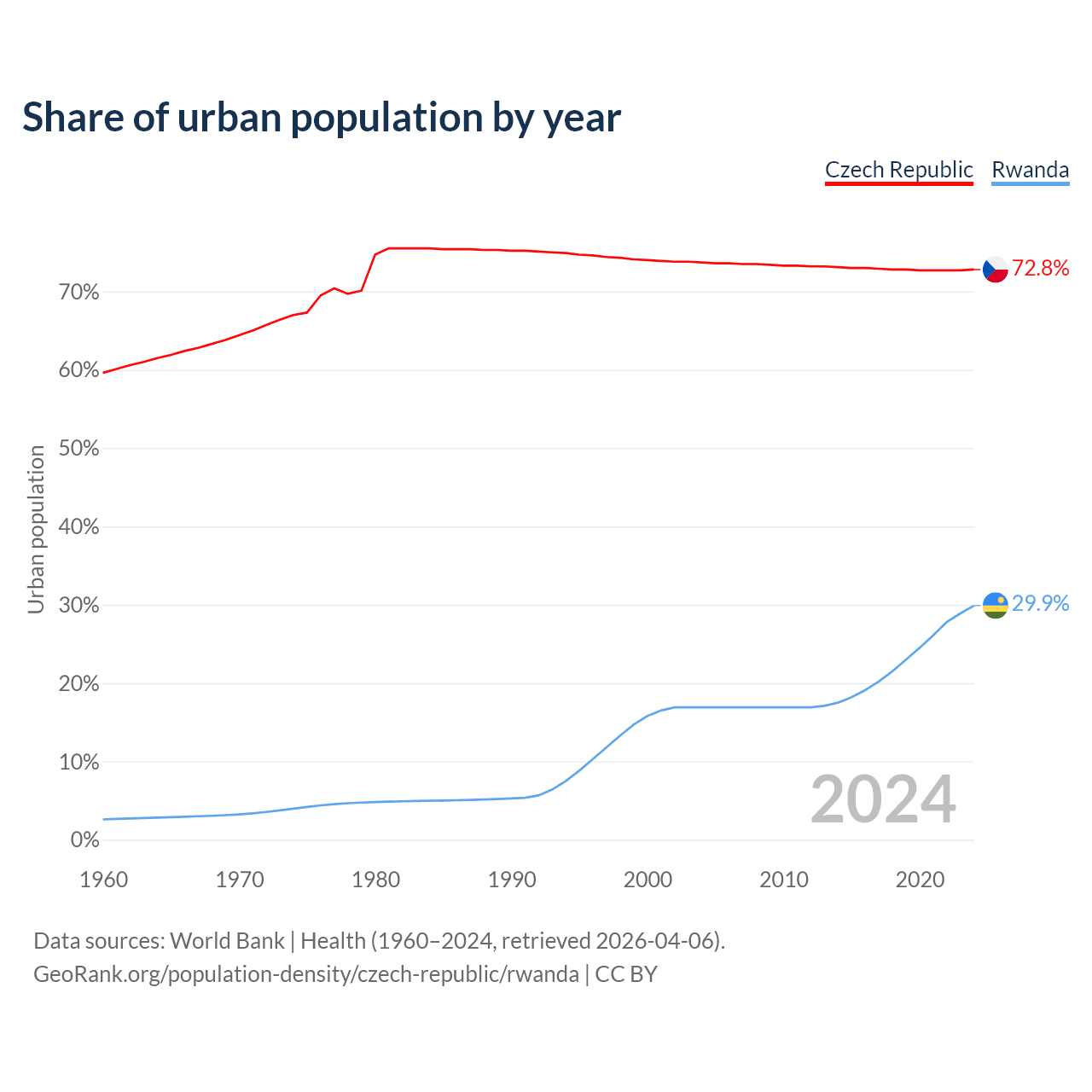 From 2004 to 2024, the share of urban population changed from 73.7% to 72.8% in the Czech Republic and from 16.9% to 29.9% in Rwanda.