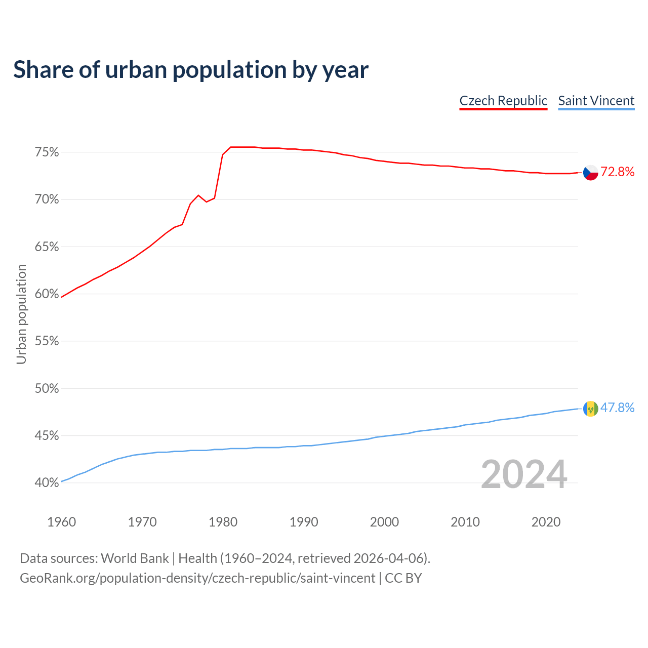From 2004 to 2024, the share of urban population changed from 73.7% to 72.8% in the Czech Republic and from 45.4% to 47.8% in Saint Vincent.