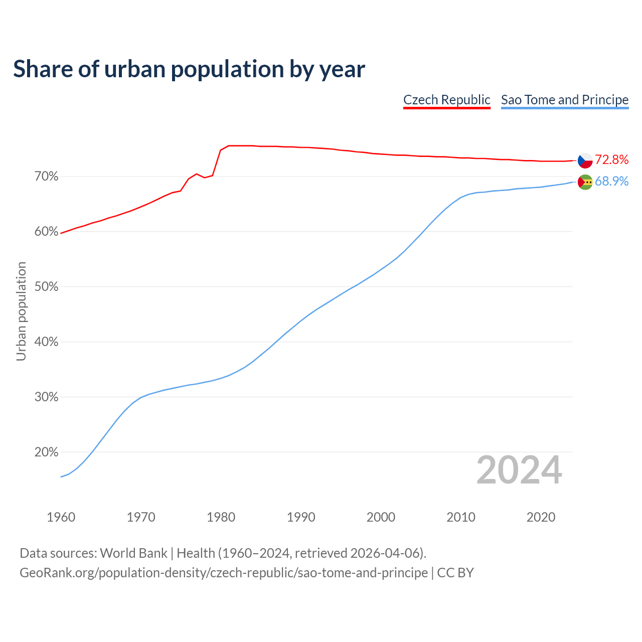 From 2004 to 2024, the share of urban population changed from 73.7% to 72.8% in the Czech Republic and from 57.9% to 68.9% in Sao Tome and Principe.