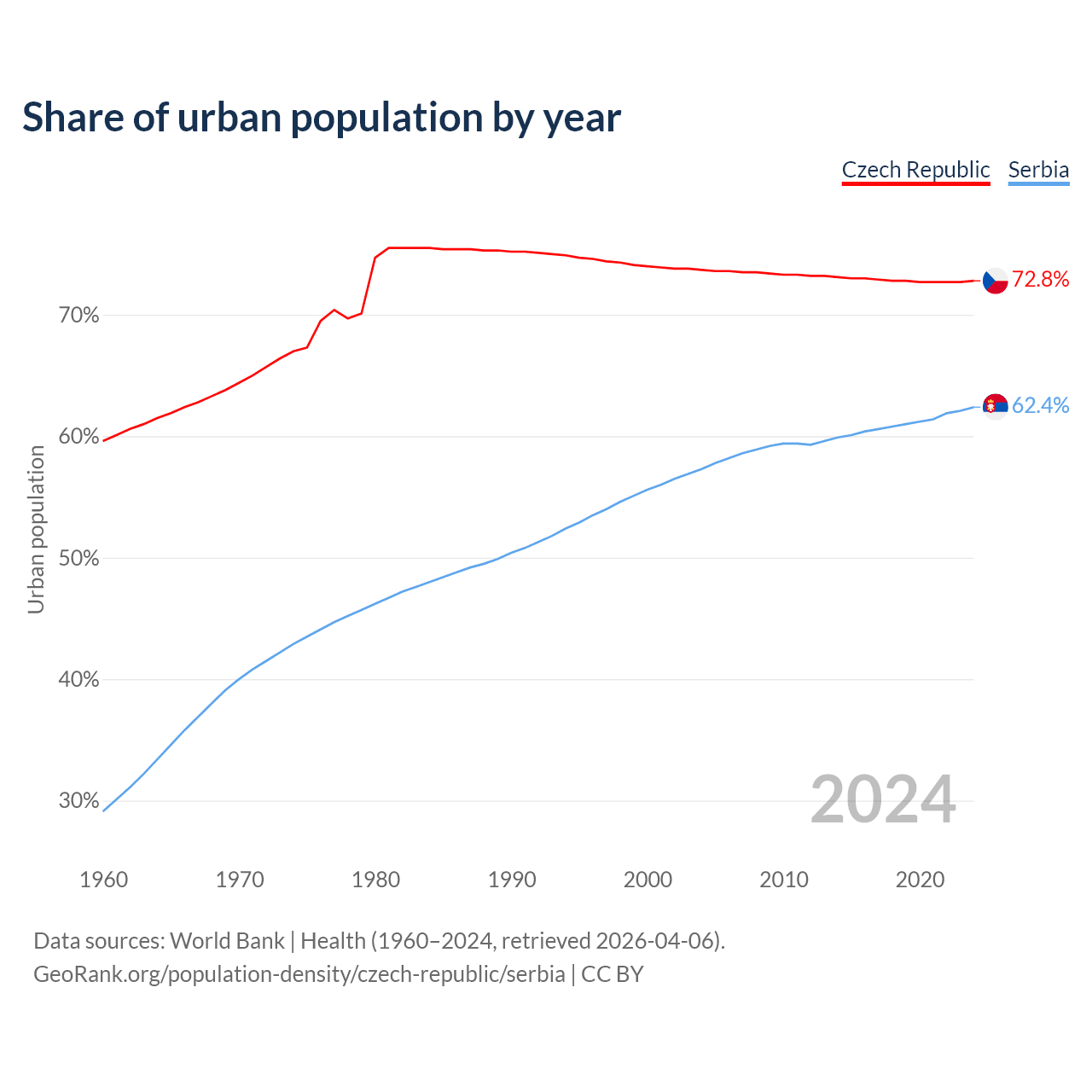 From 2004 to 2024, the share of urban population changed from 73.7% to 72.8% in the Czech Republic and from 57.3% to 62.4% in Serbia.