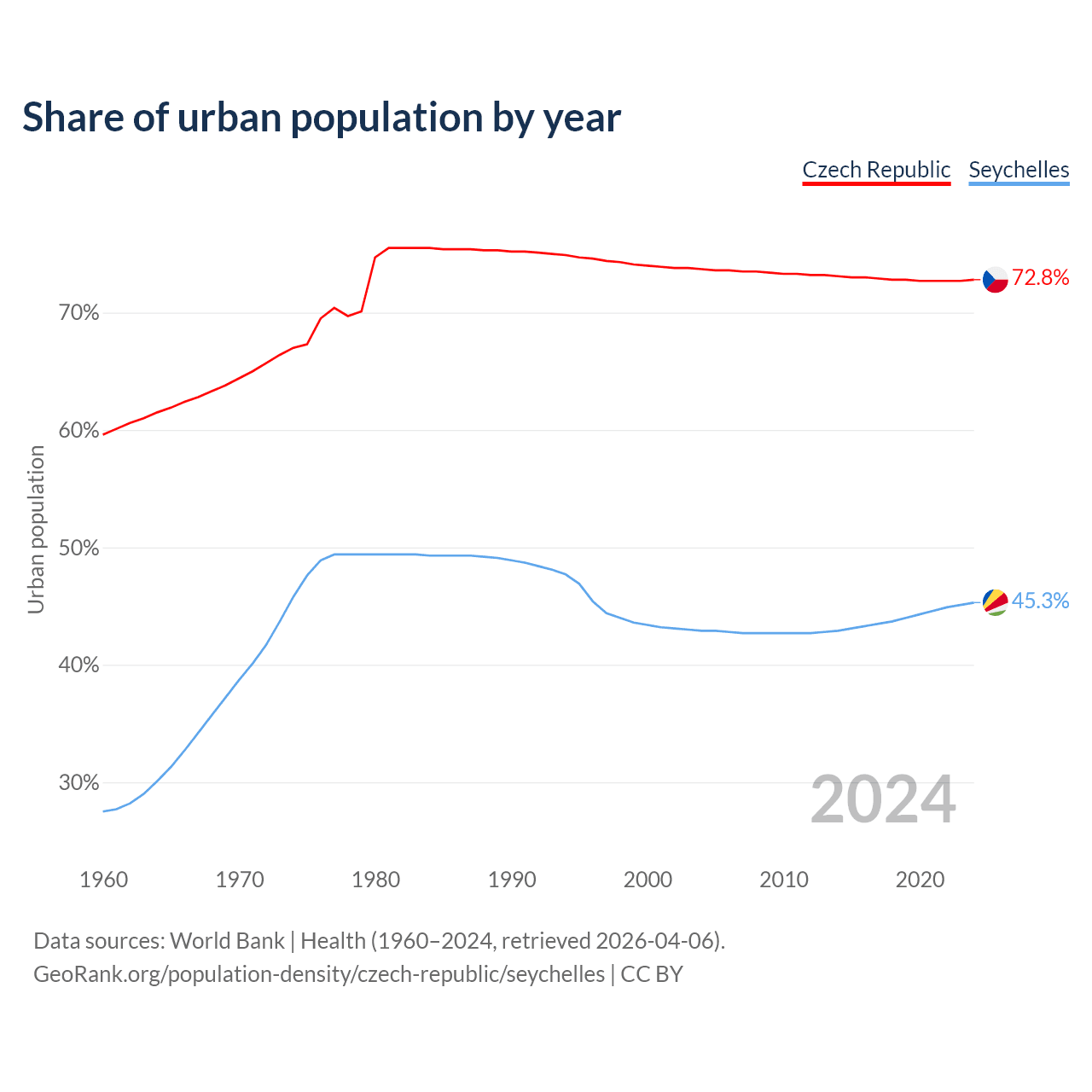 From 2004 to 2024, the share of urban population changed from 73.7% to 72.8% in the Czech Republic and from 42.9% to 45.3% in the Seychelles.