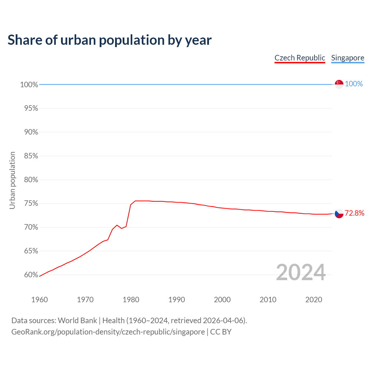 From 2004 to 2024, the share of urban population changed from 73.7% to 72.8% in the Czech Republic and from 100% to 100% in Singapore.