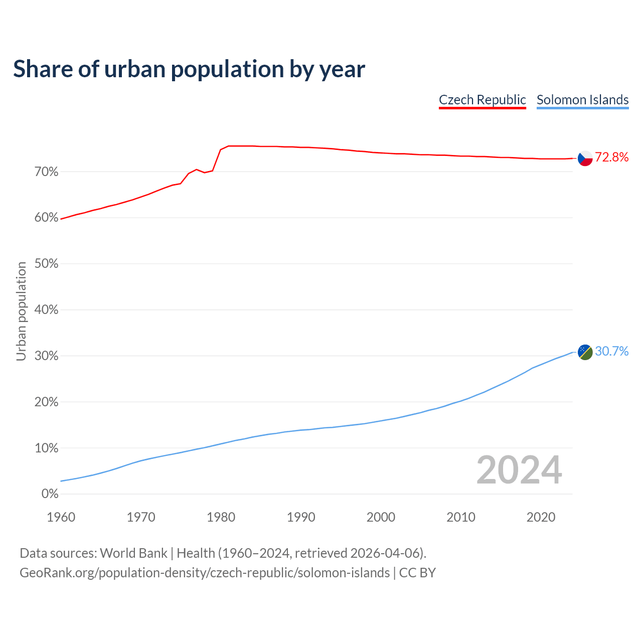 From 2004 to 2024, the share of urban population changed from 73.7% to 72.8% in the Czech Republic and from 17.2% to 30.7% in the Solomon Islands.