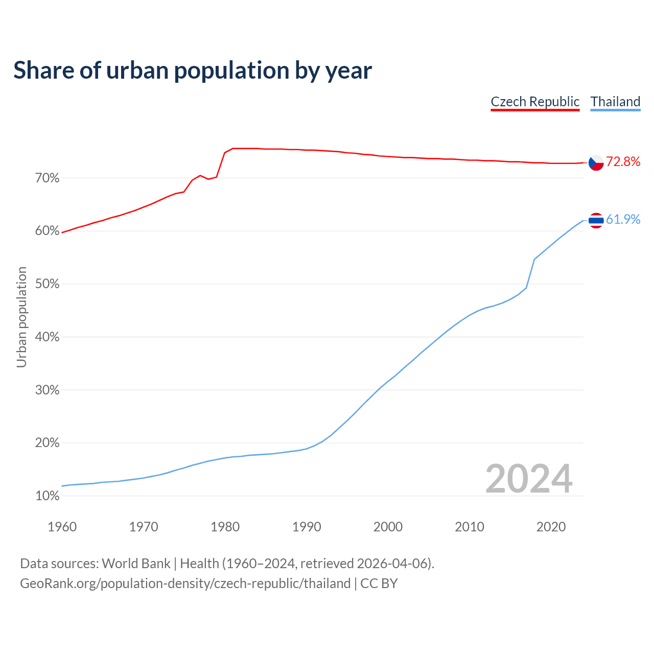From 2004 to 2024, the share of urban population changed from 73.7% to 72.8% in the Czech Republic and from 36.8% to 61.9% in Thailand.