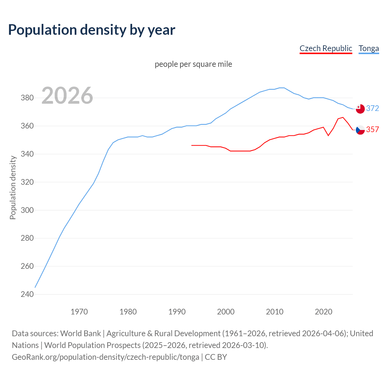The Czech Republic has a population density of 357 people per square mile compared to 372 people in Tonga. The Czech Republic has 77,850 sq ft of land per person vs 77,340 sq ft in Tonga. The Czech Republic and Tonga rank 71st and 69th by population density, respectively.
