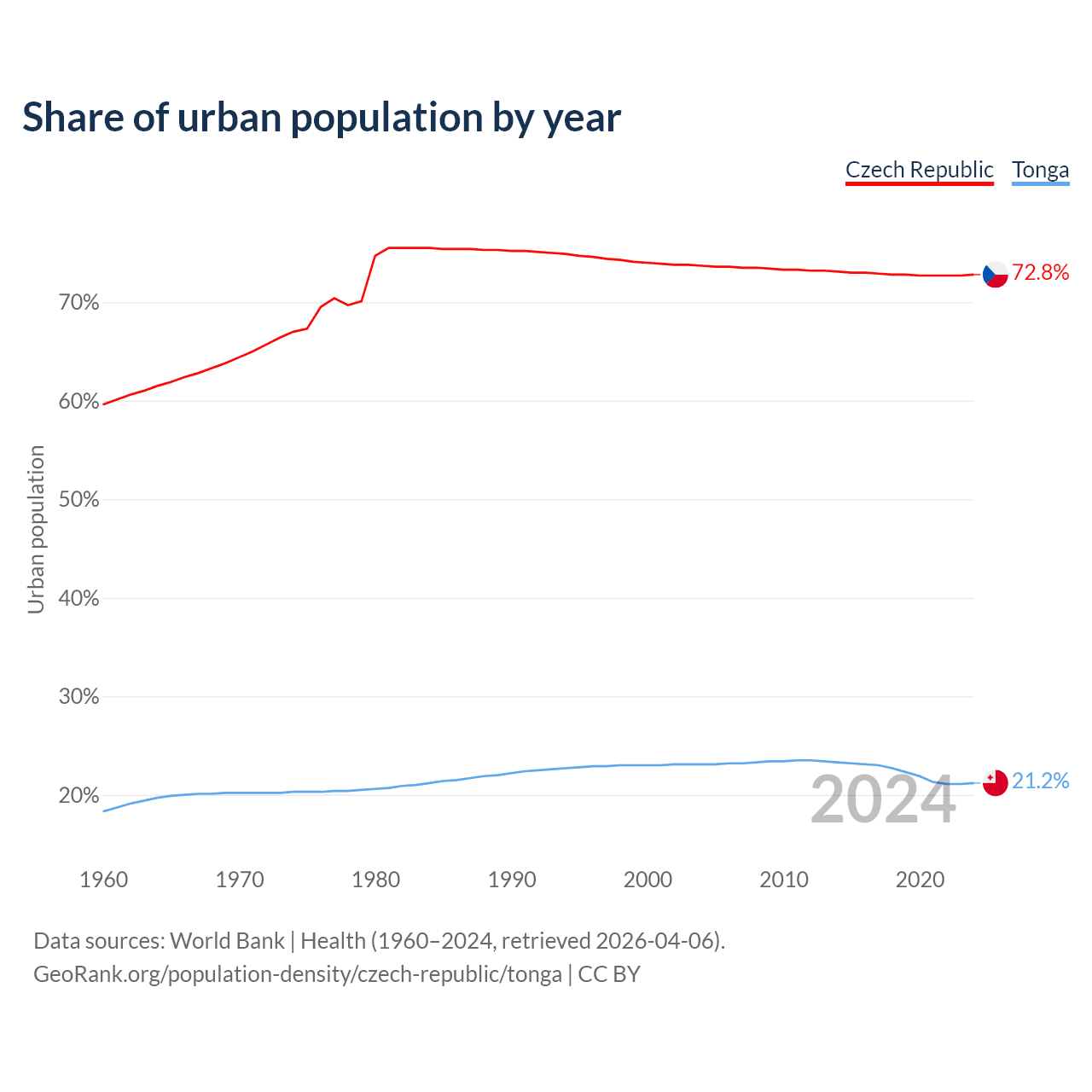From 2004 to 2024, the share of urban population changed from 73.7% to 72.8% in the Czech Republic and from 23.1% to 21.2% in Tonga.