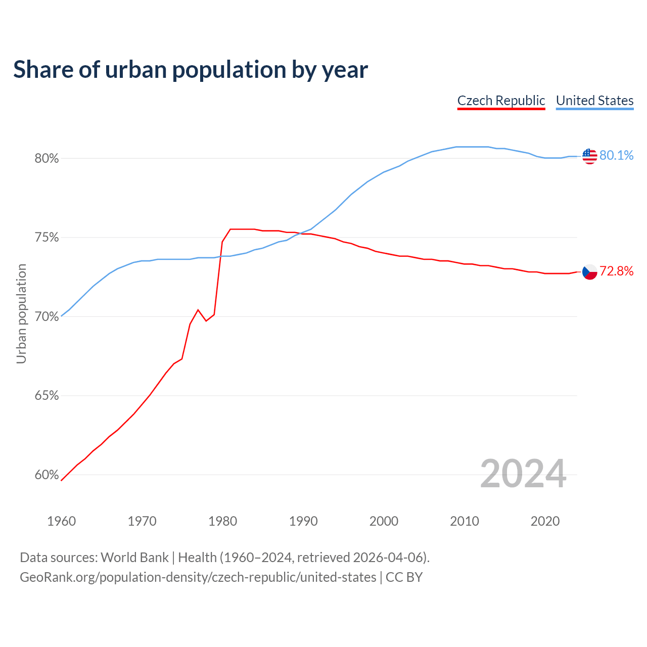 From 2004 to 2024, the share of urban population changed from 73.7% to 72.8% in the Czech Republic and from 80% to 80.1% in the United States.