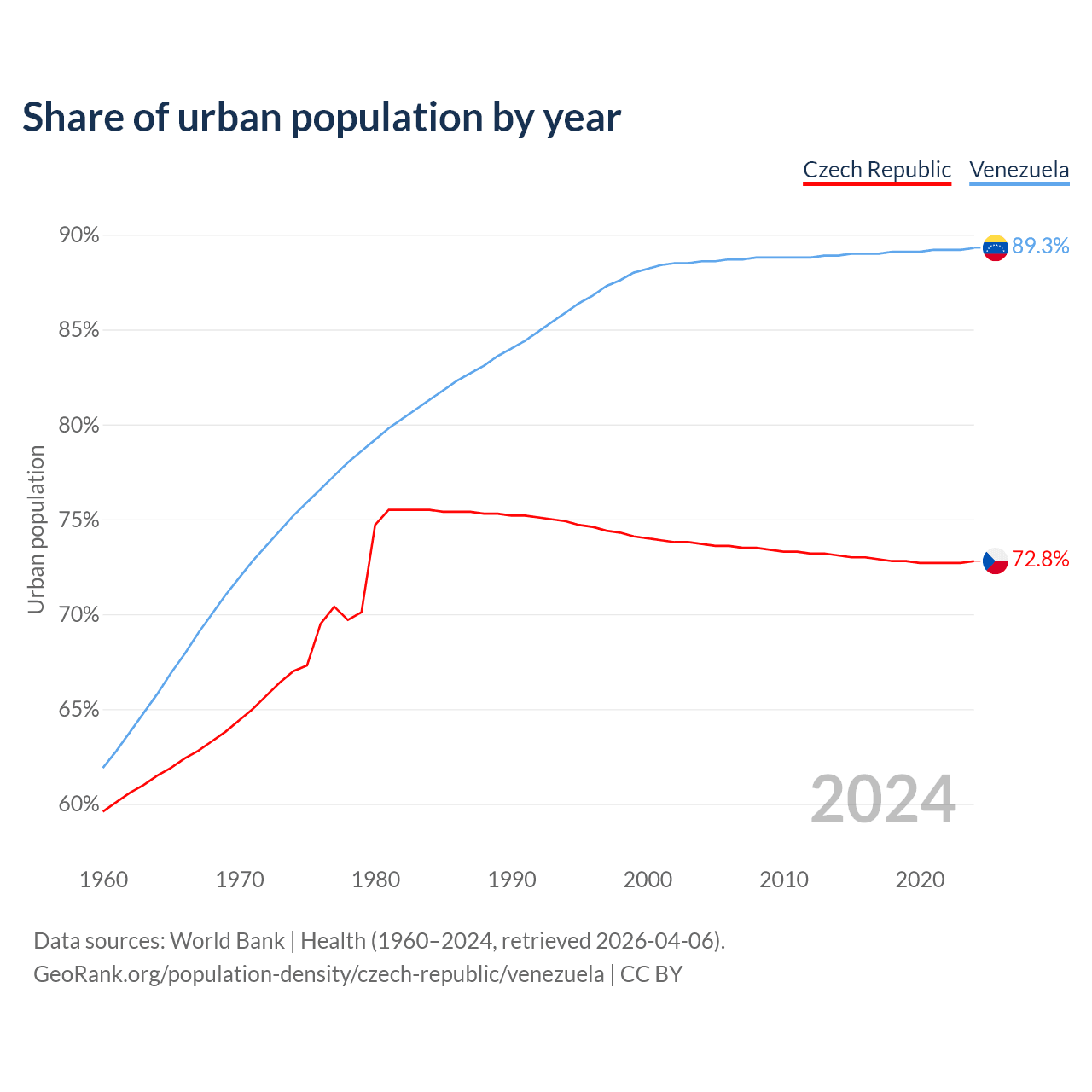 From 2004 to 2024, the share of urban population changed from 73.7% to 72.8% in the Czech Republic and from 88.6% to 89.3% in Venezuela.