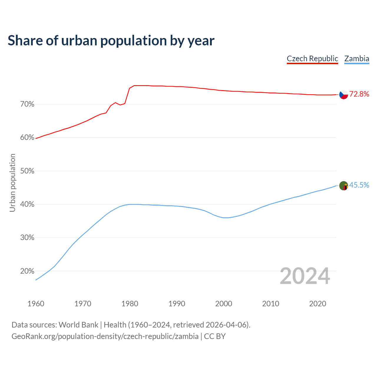 From 2004 to 2024, the share of urban population changed from 73.7% to 72.8% in the Czech Republic and from 36.8% to 45.5% in Zambia.