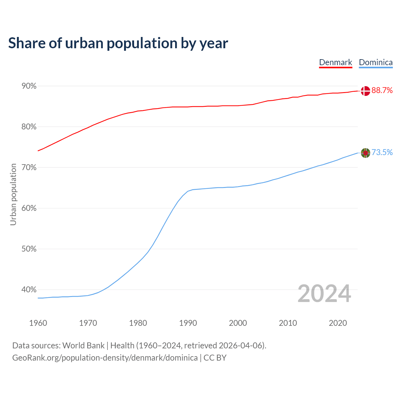 From 2004 to 2024, the share of urban population changed from 85.7% to 88.7% in Denmark and from 66% to 73.5% in Dominica.
