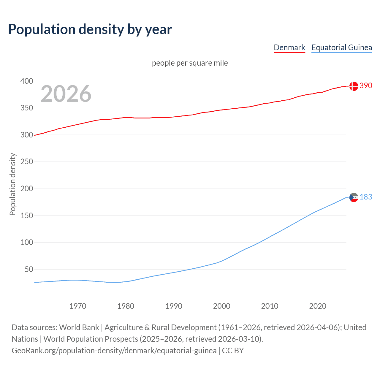 From 2006 to 2026, population density in Denmark increased by 10.9%, compared to a 100.5% growth in Equatorial Guinea.