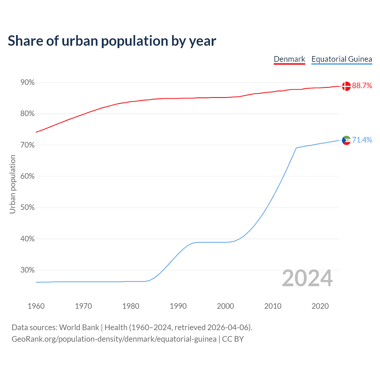 From 2004 to 2024, the share of urban population changed from 85.7% to 88.7% in Denmark and from 40.9% to 71.4% in Equatorial Guinea.
