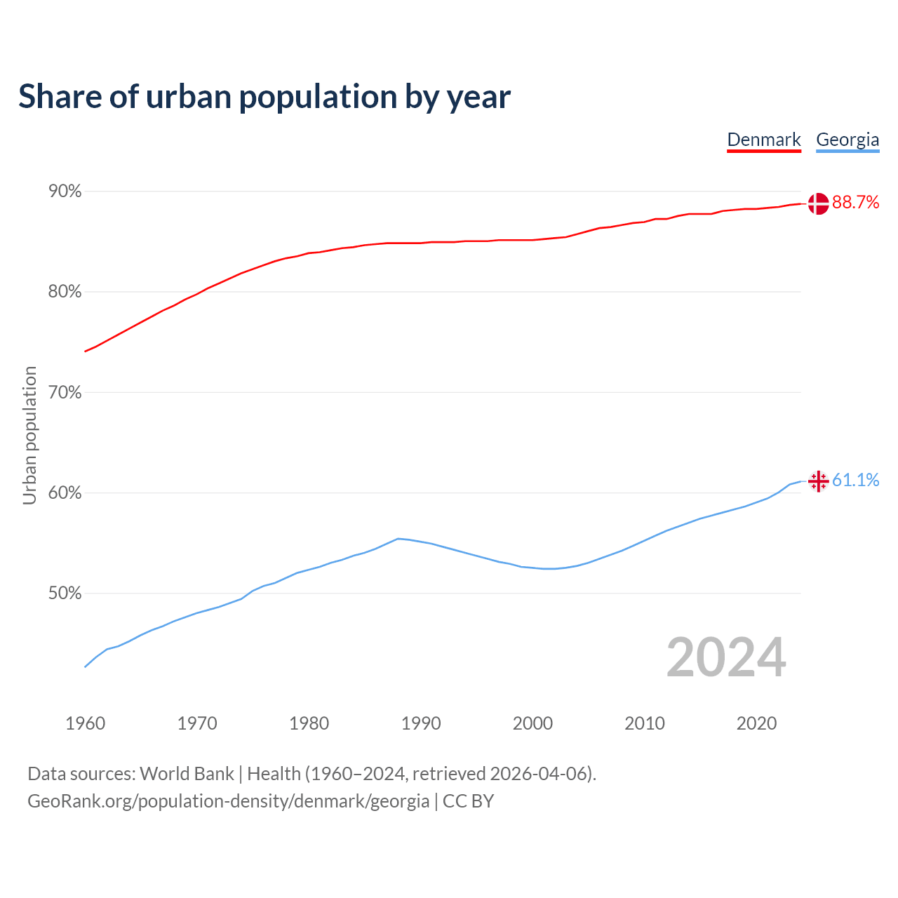 From 2004 to 2024, the share of urban population changed from 85.7% to 88.7% in Denmark and from 52.7% to 61.1% in Georgia.
