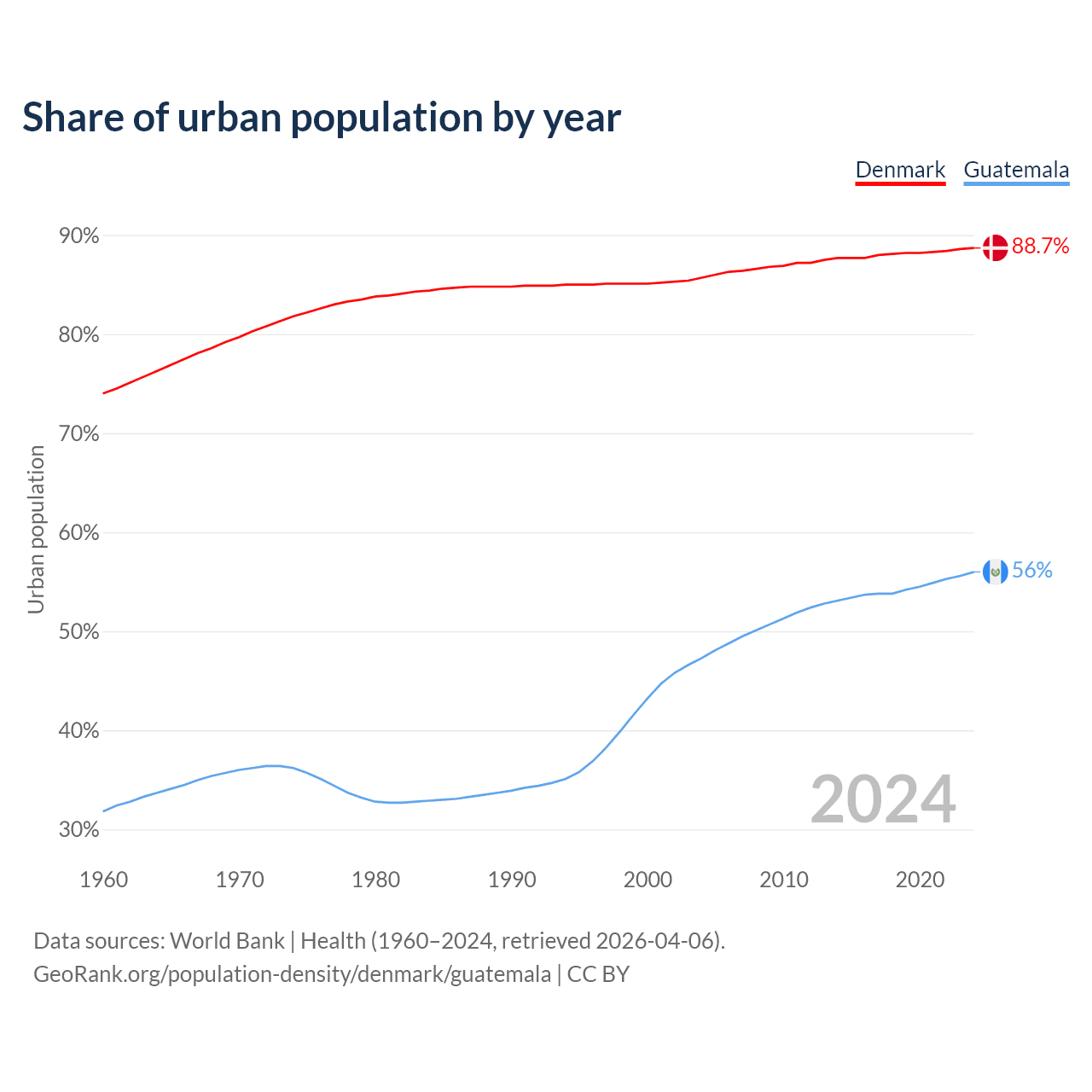 From 2004 to 2024, the share of urban population changed from 85.7% to 88.7% in Denmark and from 47.3% to 56% in Guatemala.