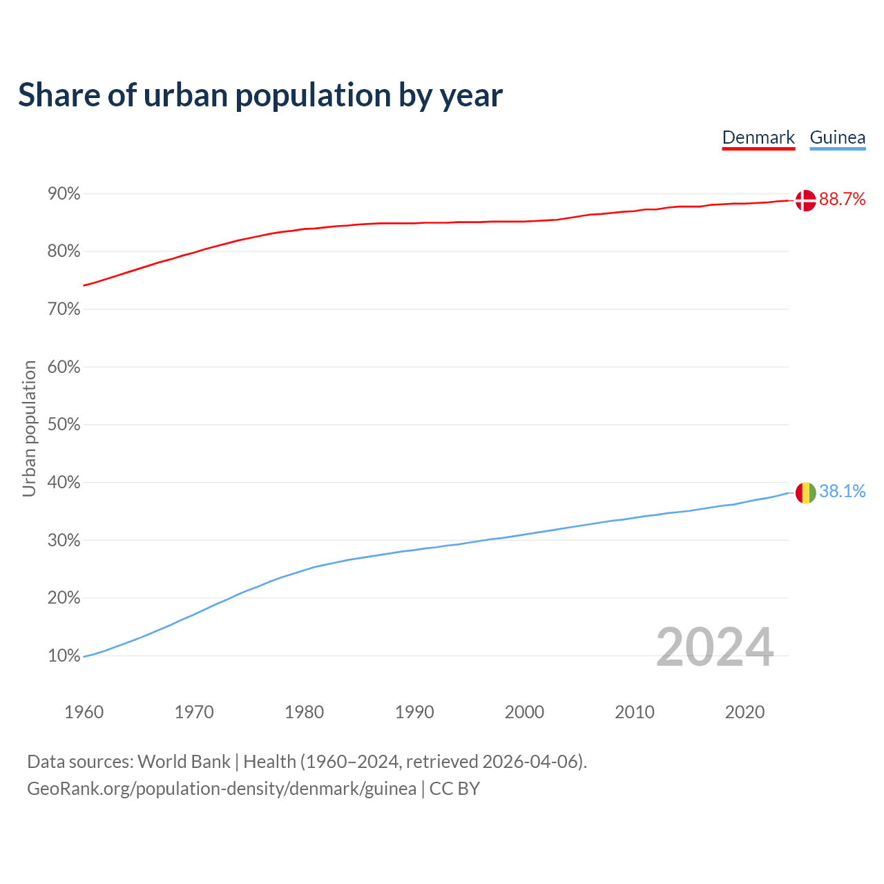 From 2004 to 2024, the share of urban population changed from 85.7% to 88.7% in Denmark and from 32.1% to 38.1% in Guinea.