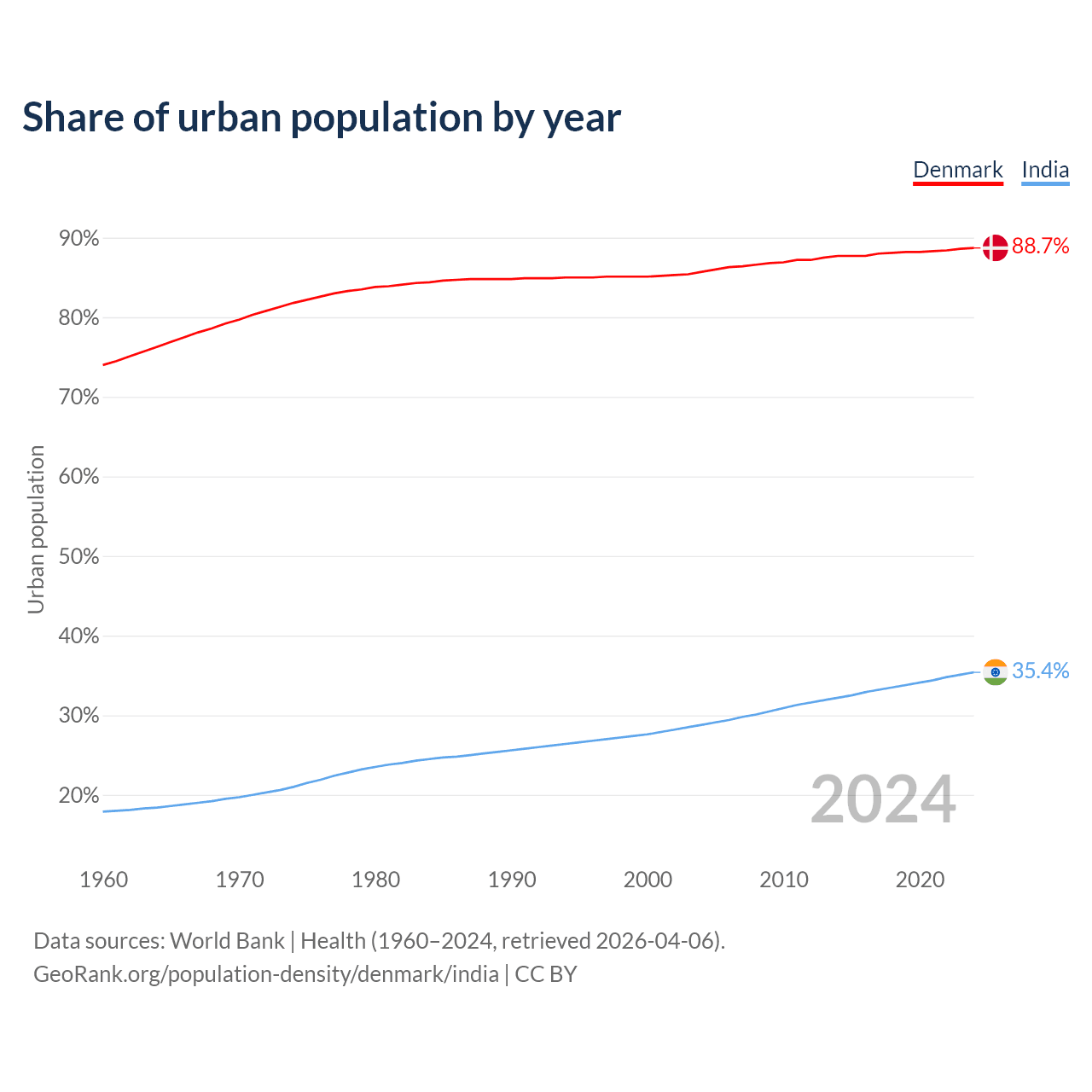 From 2004 to 2024, the share of urban population changed from 85.7% to 88.7% in Denmark and from 28.8% to 35.4% in India.