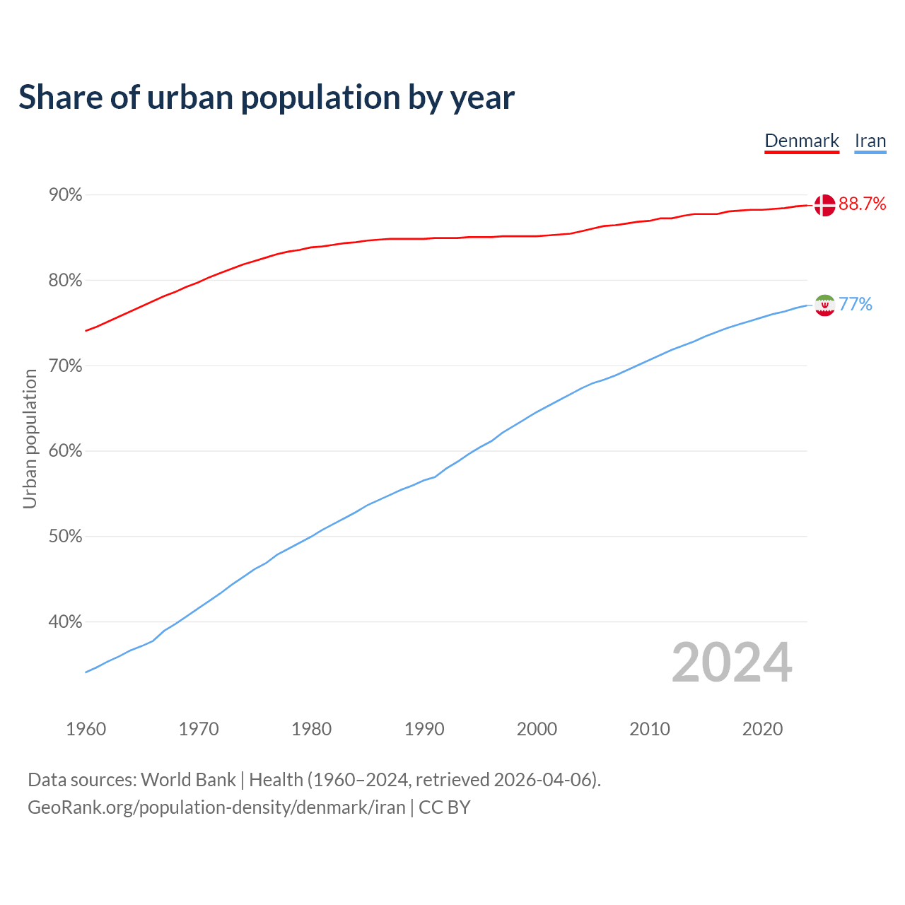 From 2004 to 2024, the share of urban population changed from 85.7% to 88.7% in Denmark and from 67.3% to 77% in Iran.