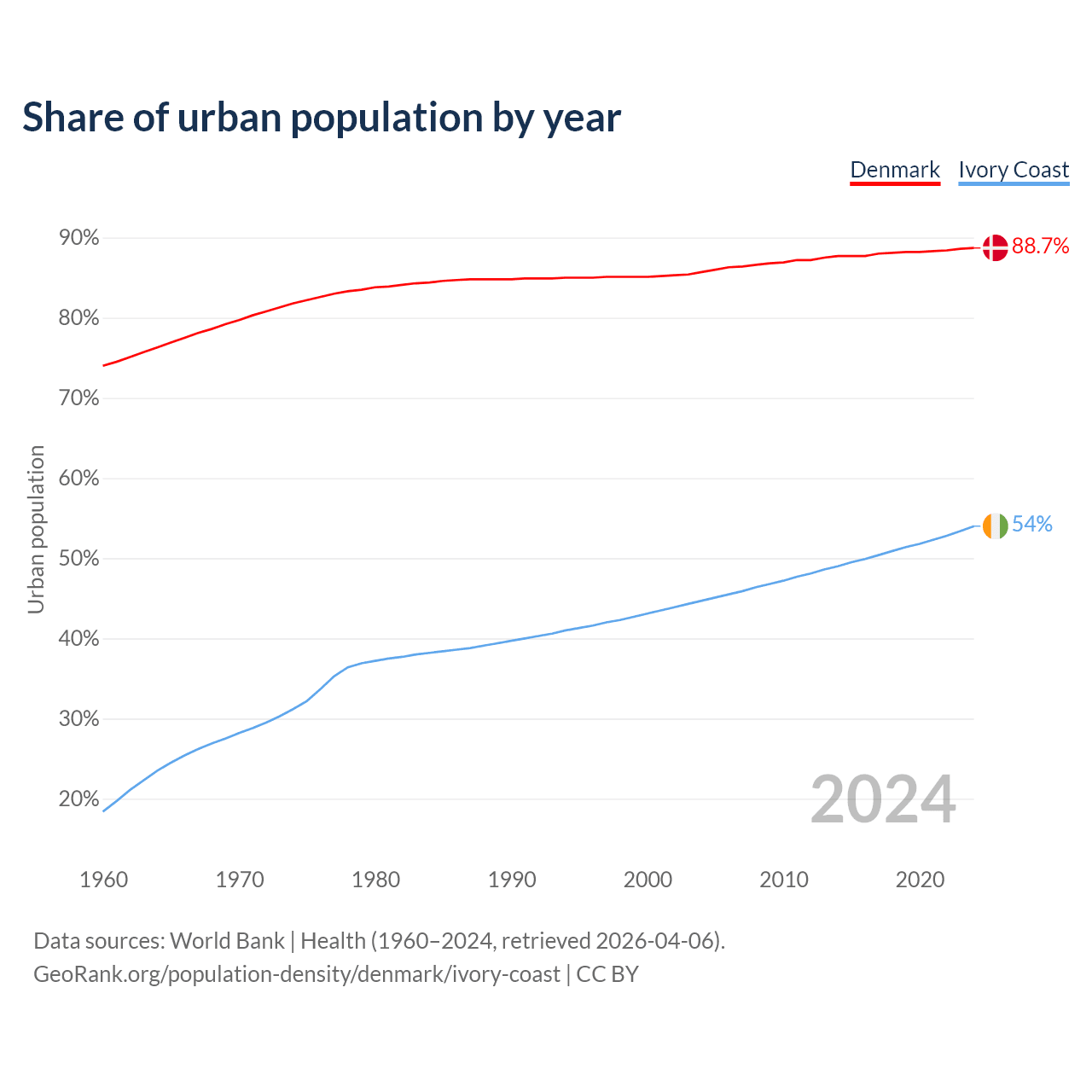 From 2004 to 2024, the share of urban population changed from 85.7% to 88.7% in Denmark and from 44.7% to 54% in Ivory Coast.