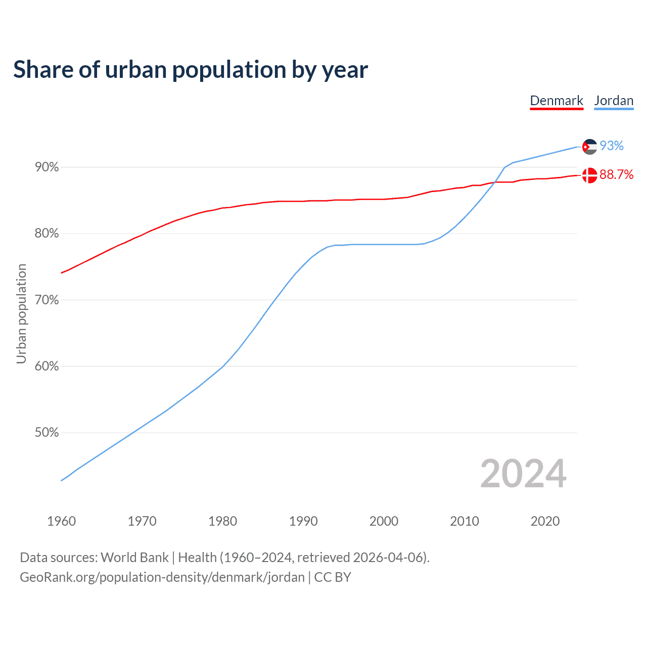 From 2004 to 2024, the share of urban population changed from 85.7% to 88.7% in Denmark and from 78.3% to 93% in Jordan.