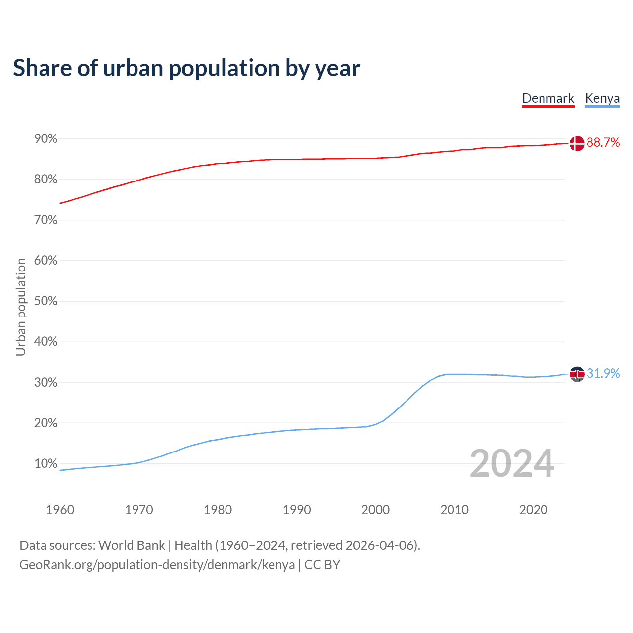From 2004 to 2024, the share of urban population changed from 85.7% to 88.7% in Denmark and from 25.4% to 31.9% in Kenya.