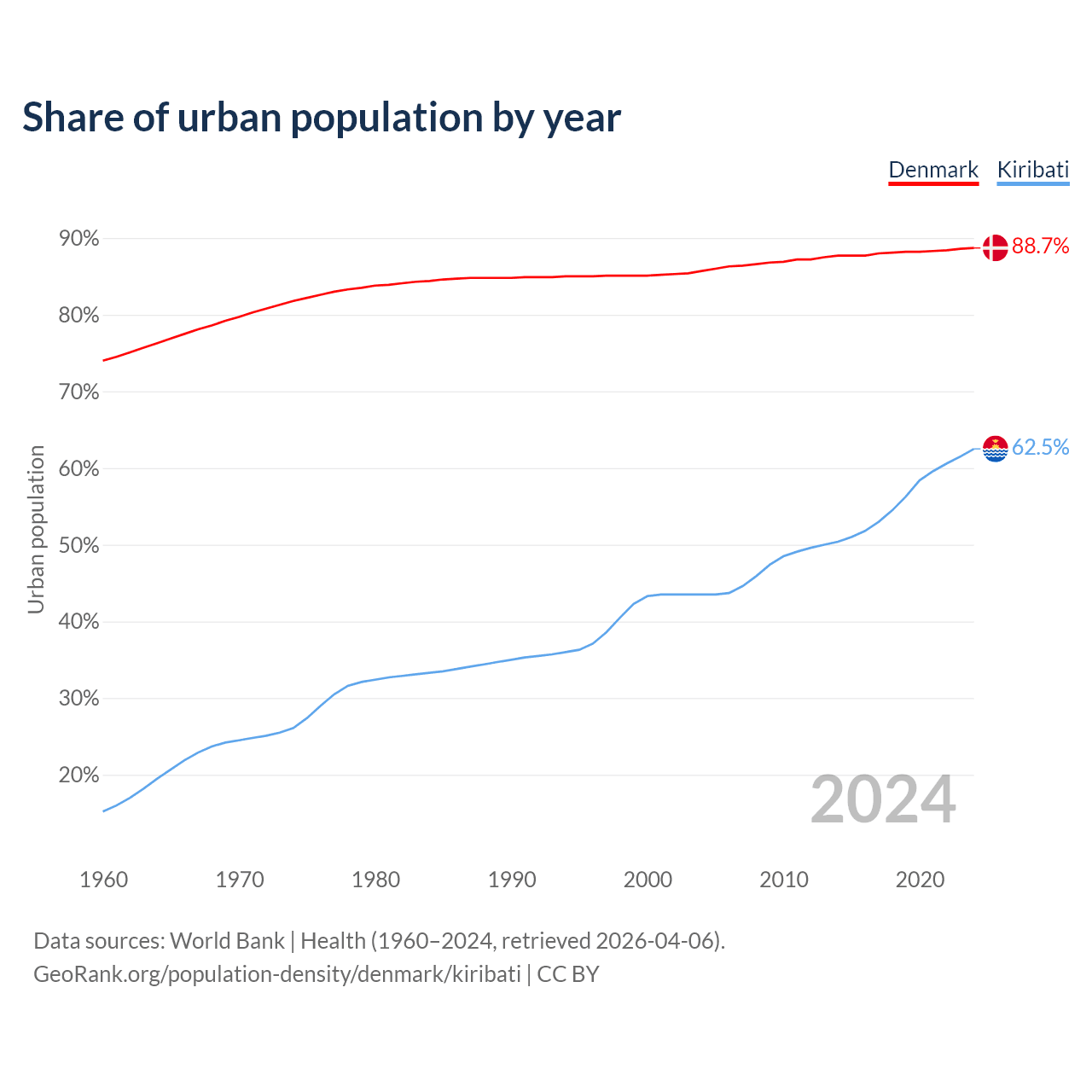 From 2004 to 2024, the share of urban population changed from 85.7% to 88.7% in Denmark and from 43.5% to 62.5% in Kiribati.
