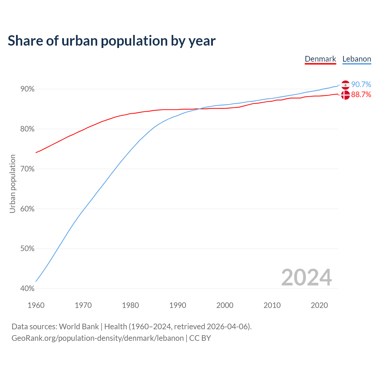 From 2004 to 2024, the share of urban population changed from 85.7% to 88.7% in Denmark and from 86.6% to 90.7% in Lebanon.