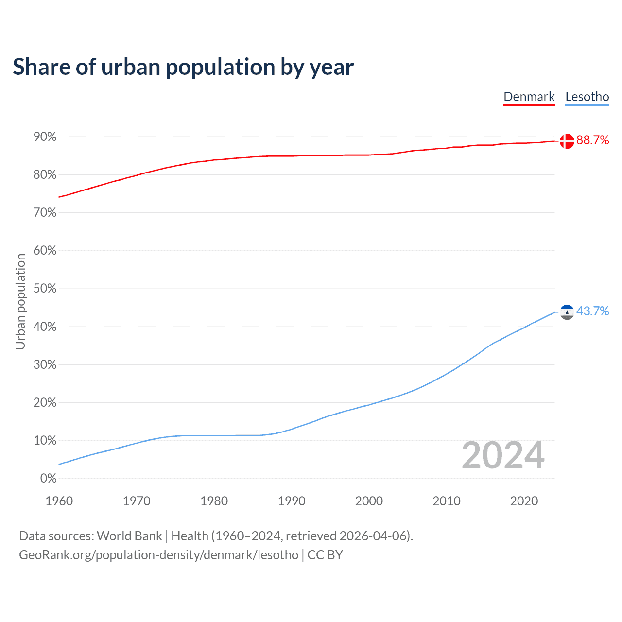 From 2004 to 2024, the share of urban population changed from 85.7% to 88.7% in Denmark and from 21.8% to 43.7% in Lesotho.