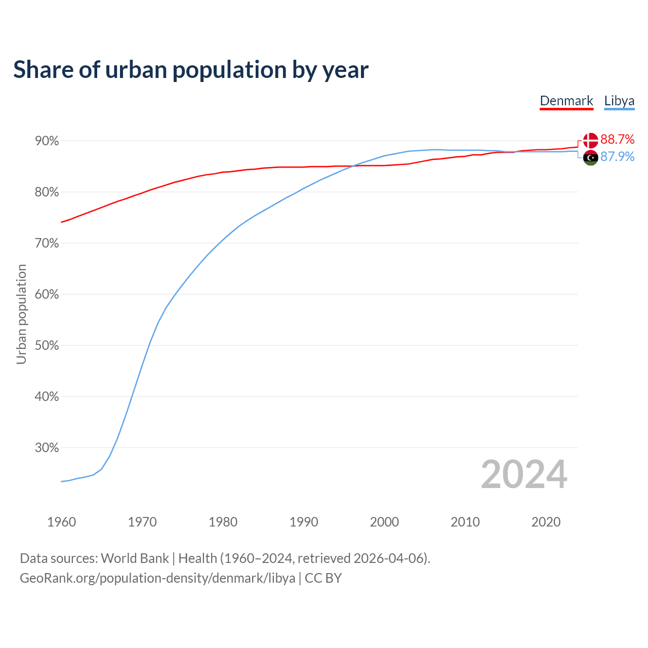 From 2004 to 2024, the share of urban population changed from 85.7% to 88.7% in Denmark and from 88% to 87.9% in Libya.