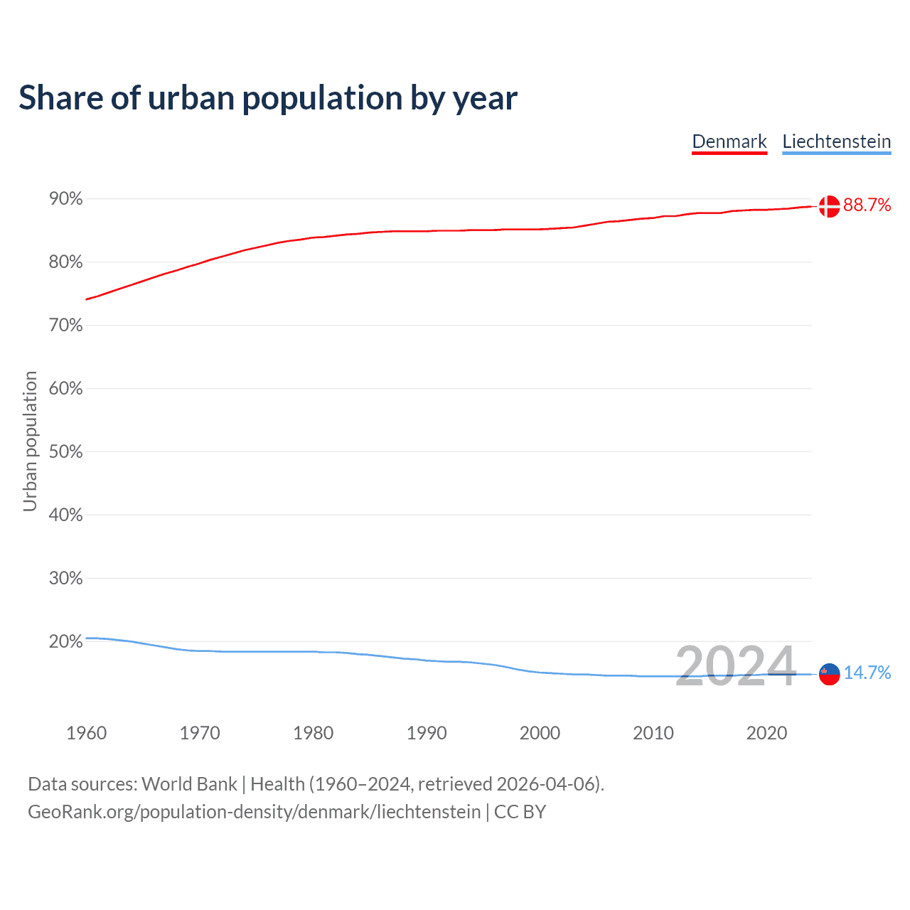From 2004 to 2024, the share of urban population changed from 85.7% to 88.7% in Denmark and from 14.7% to 14.7% in Liechtenstein.