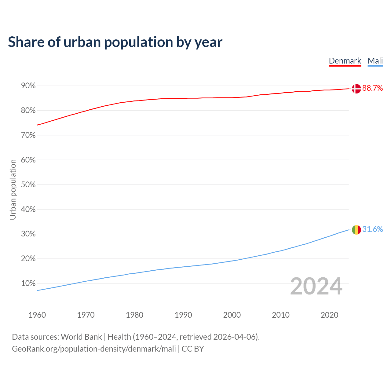 From 2004 to 2024, the share of urban population changed from 85.7% to 88.7% in Denmark and from 20.5% to 31.6% in Mali.
